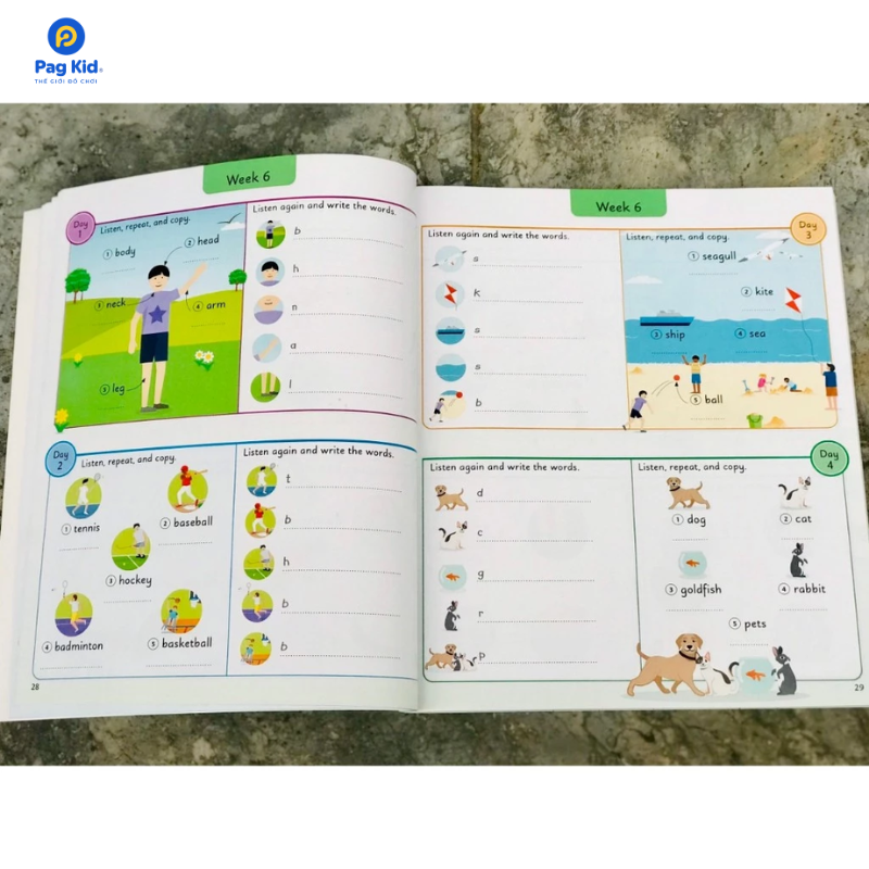 Mỗi ngày một bài học nhỏ với nhiệm vụ đơn giản như nối hình, tô màu, tìm cặp giống nhau, đếm vật thể, v.v.
