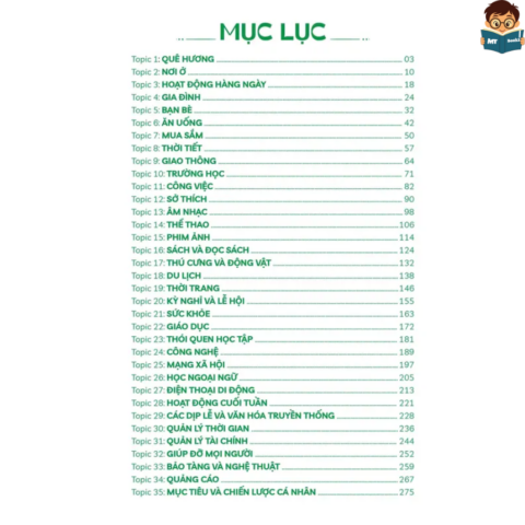Sách tổng hợp 35 chủ đề tiếng Anh thông dụng nhất trong giao tiếp, học tập và công việc – từ quê hương, gia đình, du lịch, thời trang, sức khỏe, công nghệ… đến mục tiêu cá nhân và chiến lược học tập.